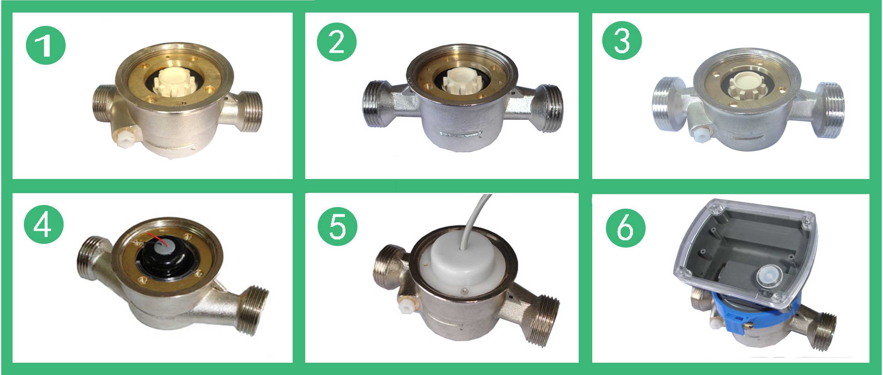 單流束有磁熱量表流量計的結(jié)構(gòu)如圖,其工作原理是:熱水進入流量計,經(jīng)進水導(dǎo)向孔沖擊計量腔內(nèi)的葉輪旋轉(zhuǎn),再經(jīng)出水導(dǎo)向孔流出流量計。葉輪上面嵌有磁鋼隨葉輪旋轉(zhuǎn),在隔板上端的韋根遠傳組件,接受葉輪旋轉(zhuǎn)的周期信號。單流束有磁熱量表流量計的殼體采用優(yōu)質(zhì)黃銅,經(jīng)金屬模鑄造、數(shù)控機床和組合機床加工,機械強度好、尺寸精度穩(wěn)定一致,塑料零件選用進口的高強度耐熱工程塑料,密封件采用優(yōu)質(zhì)耐熱材料。因此,該流量計完全能夠適應(yīng)國內(nèi)供熱系統(tǒng)的惡劣工作環(huán)境。